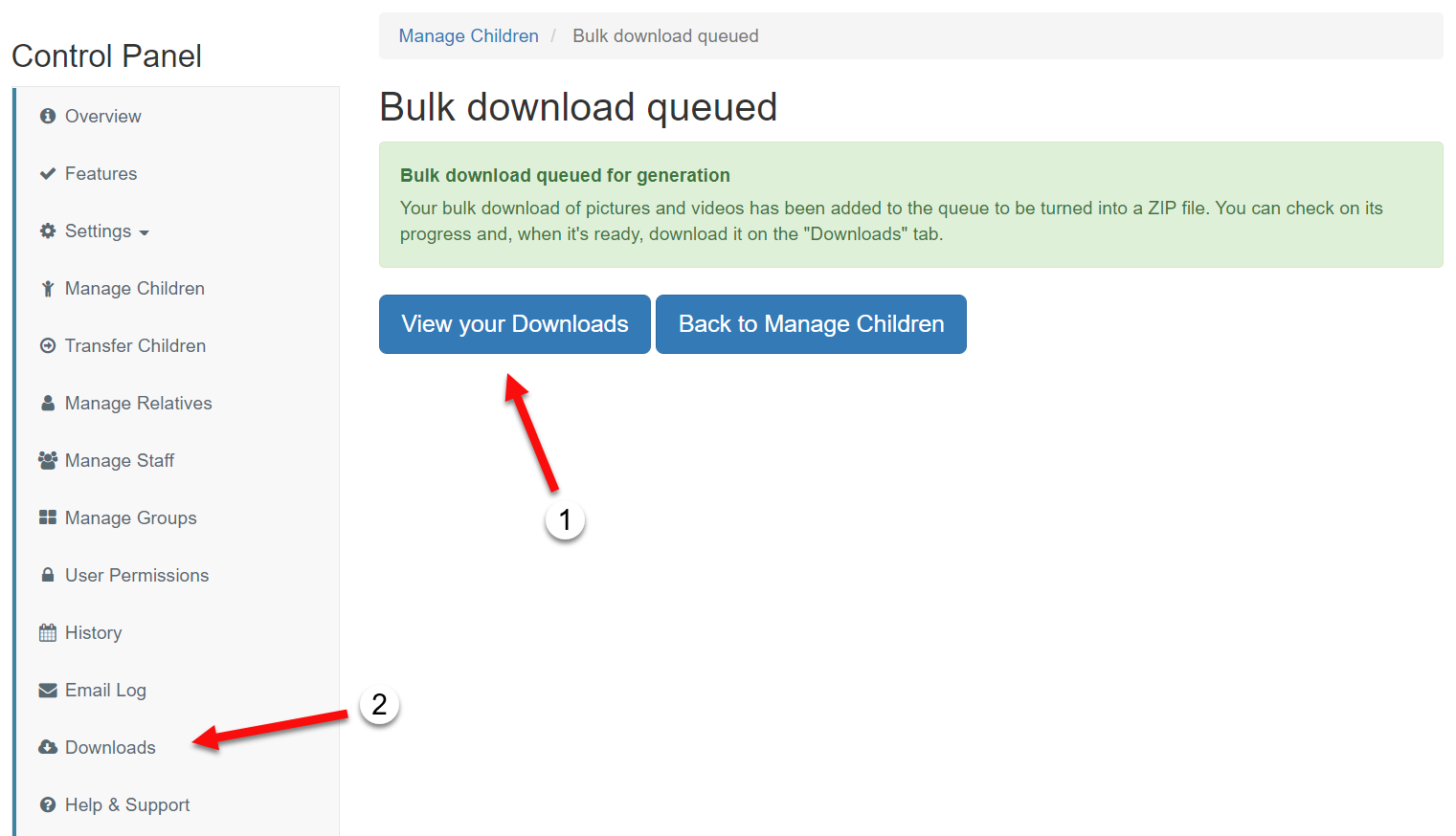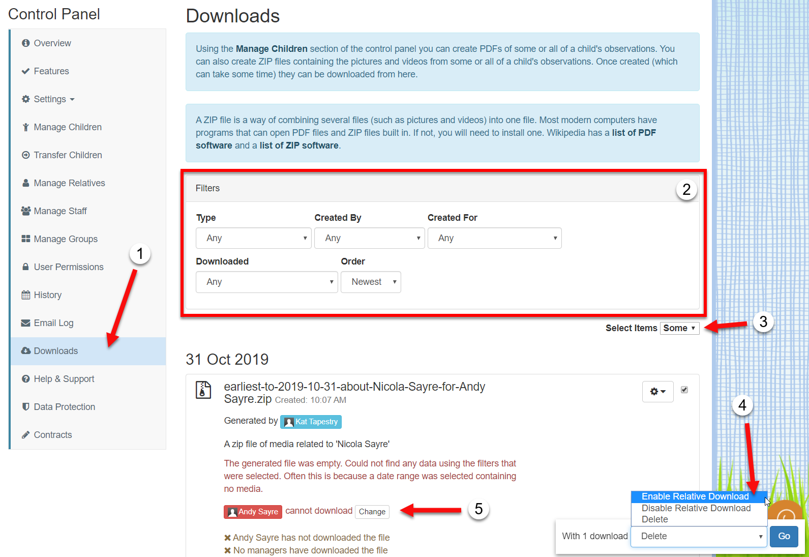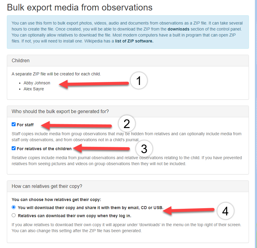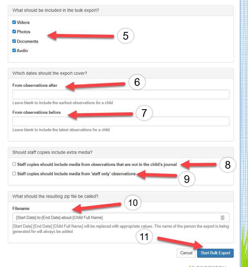 Sneha Posted July 24, 2017 Posted July 24, 2017 You can collate and export all media (photos, videos and other attached files) from all observations of a child in bulk! These can be set to be downloadable for staff and/or relatives as ZIP files. (1) You can start this process by going to your 'Control Panel' on Tapestry and clicking on the 'Manage Children' tab. (2) From here, you can either bulk export media for one child or several/all children on your account. To export media for one child, locate the name of the child you wish to download media for and click on the cog icon along the line their name. (3) From here select 'bulk export media'. Alternatively, if you want to export media for multiple children: (1) Select the children you'd like to export the media for manually by ticking the box next to their names. (2) Alternatively, to select all children on that page, use the 'Select Items: All' option at the top. Note that the default number of children per page is 20. If you have more children than this, then you can change the number per page from the drop-down box (A). (3) Choose 'Bulk export photos and videos' from the pop-up options box. (4) Press 'Go'. You can also use the filters to search for groups, e.g. Penguin Class, so you can export journals for specific groups of children. For that, you'll need to be on the 'All' children list and then click on 'filter & sort' at the very top and then change the filters accordingly. You will be able to both filter by group (1) and also status (2). Press submit (3) when ready. Once you have pressed 'Go' you will be taken to the following page: (1) Shows you the name of the child(ren) you are exporting the media for. (2) Selecting this option allows staff members who have access to the child's profile to download the ZIP file of all media for that child. Staff copies include media from group observations that may be hidden from relatives and can optionally include media from staff only observations, and from observations not in a child's journal (3) Selecting this option allows relatives who have access to the child's profile to download the ZIP file of all media for that child. Relative copies include media from journal observations and relative observations relating to the child. If you have prevented relatives from seeing pictures and videos on group observations then they will not be included. (4) If you select 'Relatives' as the recipient of the media, you can either export the media for them and share it with them by email, CD or USB. Or alternatively you can allow the relatives to download their own copy directly from their own profiles when they log in. (5) You select either photos, videos documents or audio, or all, to be included in your export. (6) and (7) If you wish to export media from observations that start from a specific date and end at a specific date, you can enter the dates in these fields. If left blank, all media from all observations (from the earliest date to the latest date) will be included in the export. (8) If this option is ticked, staff copies of the exports will include media from observations that are not in the child's journal. (9) If this option is ticked, staff copies of the exports will include media from 'staff only' observations (10) This field has been preset so that when the journal is exported, it has specific file name. You can also edit this field to name the file as you wish. (11) Click on 'Start Bulk Export' for the ZIP file to be generated and you will then be directed to the page below. (1) If you click on 'View your downloads' you will be directed to the (2) 'Downloads' tab in your Control Panel menu. Here you will see an updated screen which includes tabs for PDF journal downloads and for bulk media exports as follows: (1) Previously named 'PDF downloads', this has been renamed to 'Downloads' as this page now lists all downloads (journals and media exports). (2) Filters: These filters will allow you to search your downloads by: - Download type (journal, media or accident form), - who created the download, - who was it created for (staff, relatives, and specific users), - download status (downloaded by recipient, not downloaded by recipient, downloaded by staff, not downloaded by staff) - order (3) By selecting 'some' or 'all' of the exports on each tab, a pop up box (4) will appear in the bottom right hand corner of the page where you can change the permissions for the recipient. You can disable or enable the recipients (staff and/or relatives) to download the journals and/or ZIP files of the bulk export of media as required. (5) The permission will change here from 'can download' to 'cannot download'.. You can find more information about how to generate journals to PDF at this tutorial. Please feel free to send in any support requests to customer.service@eyfs.info if you require any further assistance. Go back to Main Tutorials Page