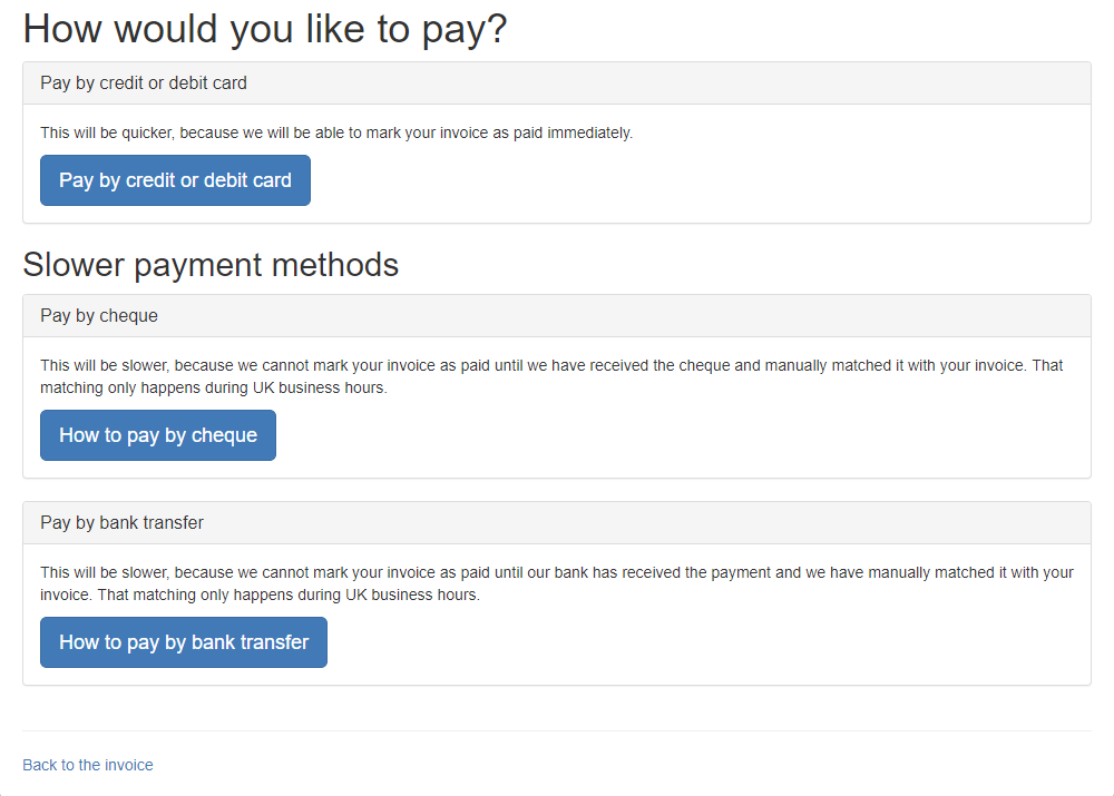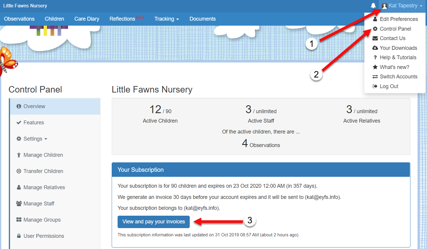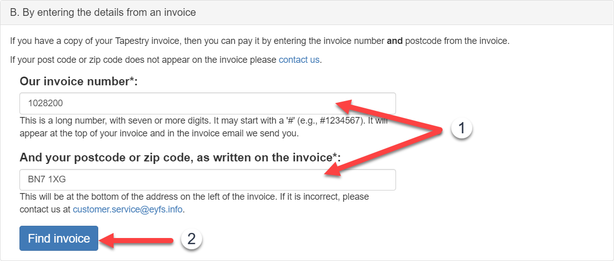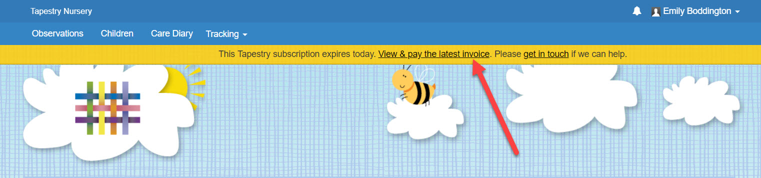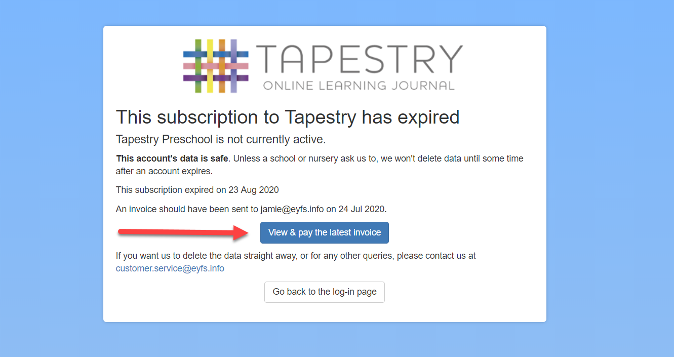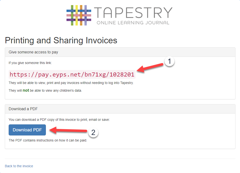 OlayaTapestrySupport Posted October 24, 2017 Posted October 24, 2017  On Tapestry you can access, pay your invoices by card and find information on how to pay invoices by BACS or cheque. We'll start by looking at how to access your invoice. If you would like to skip to the section on paying your invoice, click here.  Accessing your invoice There are several different ways you can get to your most recent Tapestry invoice: 1. Going to the Control Panel (1)(2), staying on the 'Overview' page and clicking on the 'View and pay your invoices' button (3). Please note only managers on Tapestry can access the control panel.   2. If your account is up for renewal, there will be a yellow banner at the top of the page which tells you when your account will expire and will also include a link to your invoice.   3. If your account has expired, when you try and log in on the browser version of Tapestry, you will get a message explaining why you can't log in to your account, and this will also include a link to your invoice.   4. If you aren't signed up to the Tapestry package, you can still access the invoice if you know the invoice number and the post code associated with the account. To do this, go to pay.tapestryjournal.com, and enter your invoice number and postcode that's listed on your account (1) and then click 'Find Invoice' (2).    Paying your invoice  Once you've accessed your invoice, you can Pay, Share or Download it (1). You'll also be told if there are any other invoices linked with your account that are also awaiting payment (2).   To pay your invoice, click Pay and you'll be given the option to pay by card, cheque or bank transfer. If you decide to pay by bank transfer or cheque, please remember to quote your invoice number so we can identify your payment. While card payments are usually instant, cheque and bacs payments can take 5 working days to process.   You can share your invoice by clicking the Share button. Here you will see a direct link to your invoice (1), so if you have a payments/finance team struggling to find the invoice, simply send them this link and they'll be able to access and pay the invoice online. You can also download your invoice to PDF (2) from this page which can then be emailed or saved.    If you have any payment queries please contact us at customer.service@eyfs.info    Go back to Main Tutorials Page