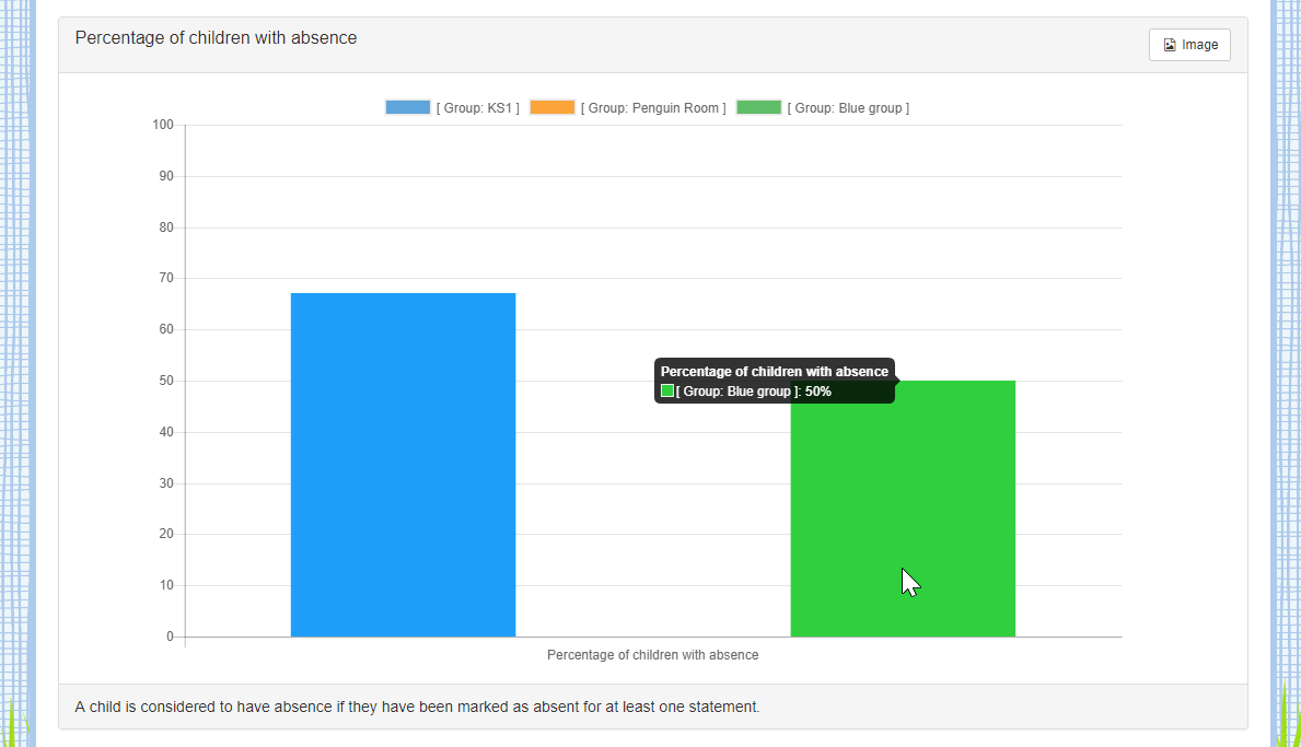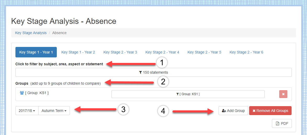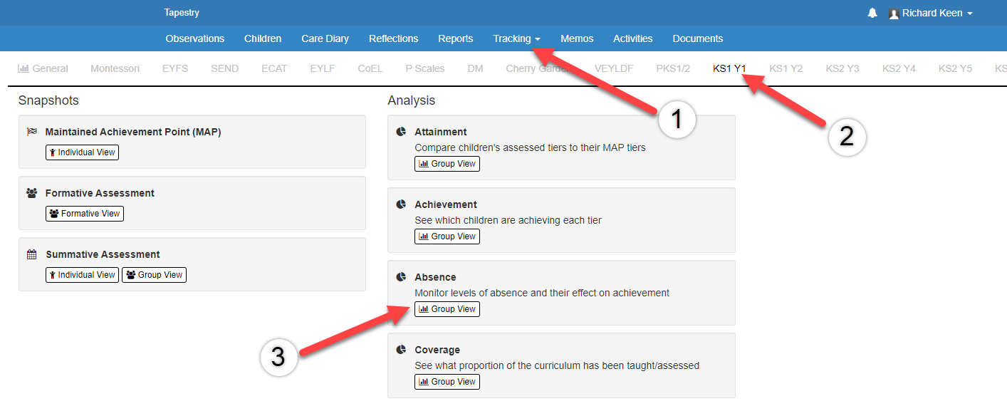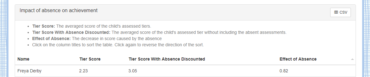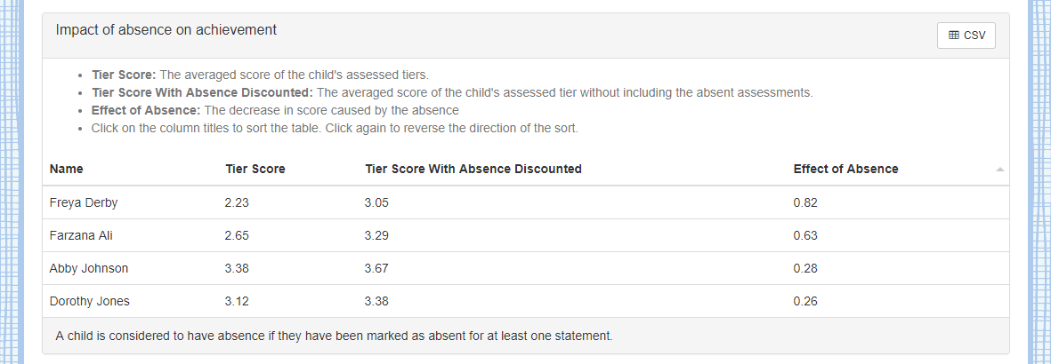 OlayaTapestrySupport Posted October 26, 2017 Posted October 26, 2017 One of the key features that we have included in the KS1/KS2 tracking systems is the 'Absence' record. Missing a lesson can have an impact on a child's learning and development, so we believe that this event should be reflected in the KS1/KS2 assessment analysis. If you haven't set up tiers, children's MAPs or haven't started assessing KS1/KS2 on your account yet, you can use the tutorials linked below to help you. Setting up KS assessments on your accountSetting Key Stage Maintained Achievement Points for childrenAssessing with the KS1 and KS2 frameworks This tutorial shows how the assessments marked as 'absent' can affect a child's average tier score for a specific period and statements. It also explains how the tier scores both with or without the 'absent' assessments are calculated, so you can understand the extent to which an absence can impact on a child's development. To find the Absence screen, you will need to navigate to the (1) Tracking tab at the top of the page. Here, you will be given the option to choose which year group you wish to analyse. For the purpose of this tutorial, I am going to analyse (2) KS1 Y1. Once you have selected the year you will then need to click the 'Group View' on the (3) Absence section to enter the area. When you have gone to the absence screen you can filter by (1) subject, area, aspect or statement. You will also be able to filter by (2) groups and (3) period. You can also (4) add more than one group if you wish to compare two or more groups. For the purpose of this tutorial, I have selected all 150 statements, and selected the KS1 group as my group, but you might want to narrow it down a little further. I have also set up the assessment period to the Autumn term. You will then be shown a table that will only include the children that have had at least one 'absent' assessment within the chosen period and group. The Tier Score column shows each child's average tier score for the selected period taking the 'absent' assessments into account. This is the figure that will show in the Attainment and Achievement analysis. Please note that for every absent assessment, the child is given a score of 0. This is, if a child has been assessed five times, but they were 'absent' for one, their score will still be calculated over 5 assessments. I.e. T3, T3, T4, T3 and 0. This is a total of 13 across five assessments, which equals an average tier score of 2.6. The Tier Score with Absence Discounted column shows what the average tier score for the selected period would be for each child if the absence scores are not included. Using the same example as before, if the absent assessment is not taken into account the results will be quite different. This figure would be a total of 13 across four assessments, as the absent assessment wouldn't contribute. This equals an average tier score of 3.25. The Effect of Absence column shows the difference between the tier score and the tier score with absence discounted, so it will show if the average tier score has decreased due to the absent assessments. In both of the above examples, the child wasn't assessed/did not receive the lesson. However, the absence score considers the loss that missing a lesson means in their learning process. Let's take a closer look at Freya: Freya has been absent on at least one of the assessments made during the Autumn term. This has had an obvious impact on her tier score. When the absence is taken in account, Freya's average tier score is set at 2.23. However, if this absence hadn't been taken into account towards the average calculation, Freya's tier score would have been of 3.05. This means that her being absent has dropped her tier score by 0.82. Considering the absent assessments on Freya's tier score will help her practitioners to evaluate her tracking more accurately. If you keep scrolling down you will see a chart that represents the percentage of children with absence for the selected period and statements. By hovering your cursor over a column you will see the exact percentage of children. If you decided to compare two groups, and set the filters up for this purpose, you will see the comparative graph results for the separate groups in this chart. Please remember that these will show the percentage of children that were absent at least once for the statements and periods specified on the filters. You can now export a printable/downloadable version of the analysis by clicking the 'PDF' button on the filtering section. You can also export either the table or the column chart by clicking 'CSV' or 'image' respectively on each figure's title. I hope this tutorial helped with the reading and understanding of your KS absence data! Back to Main Tutorials Page