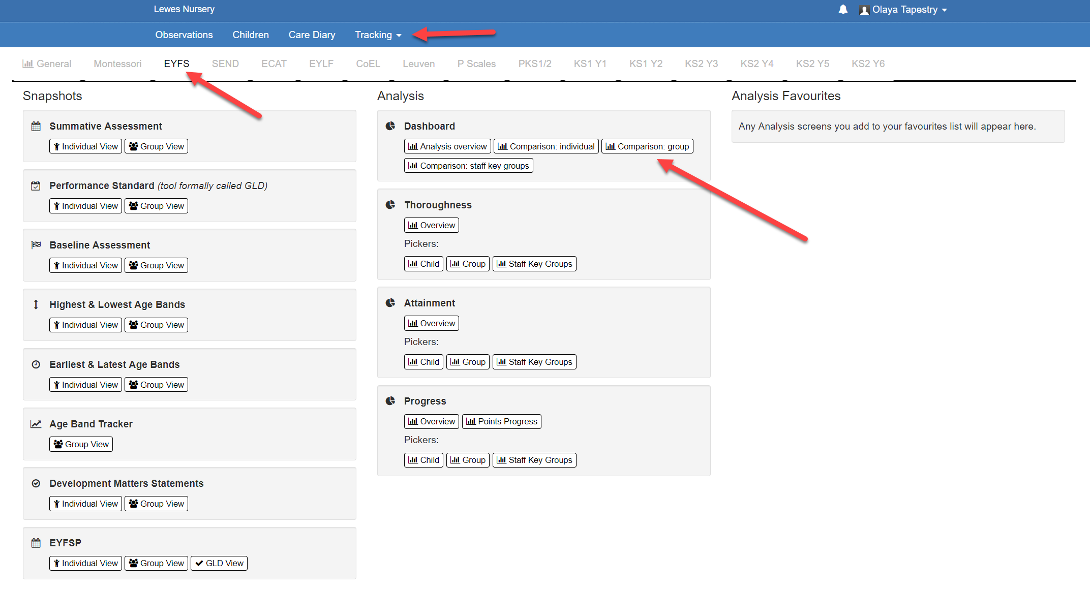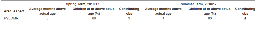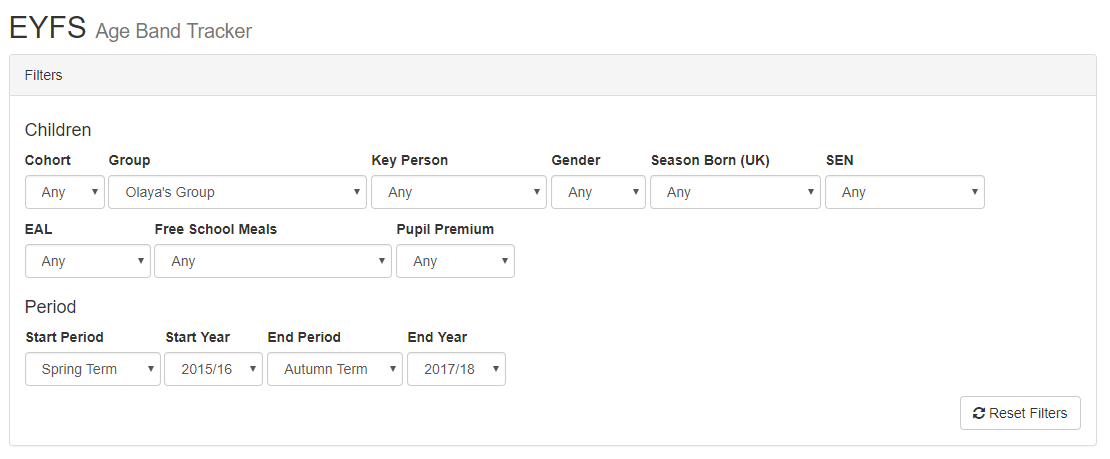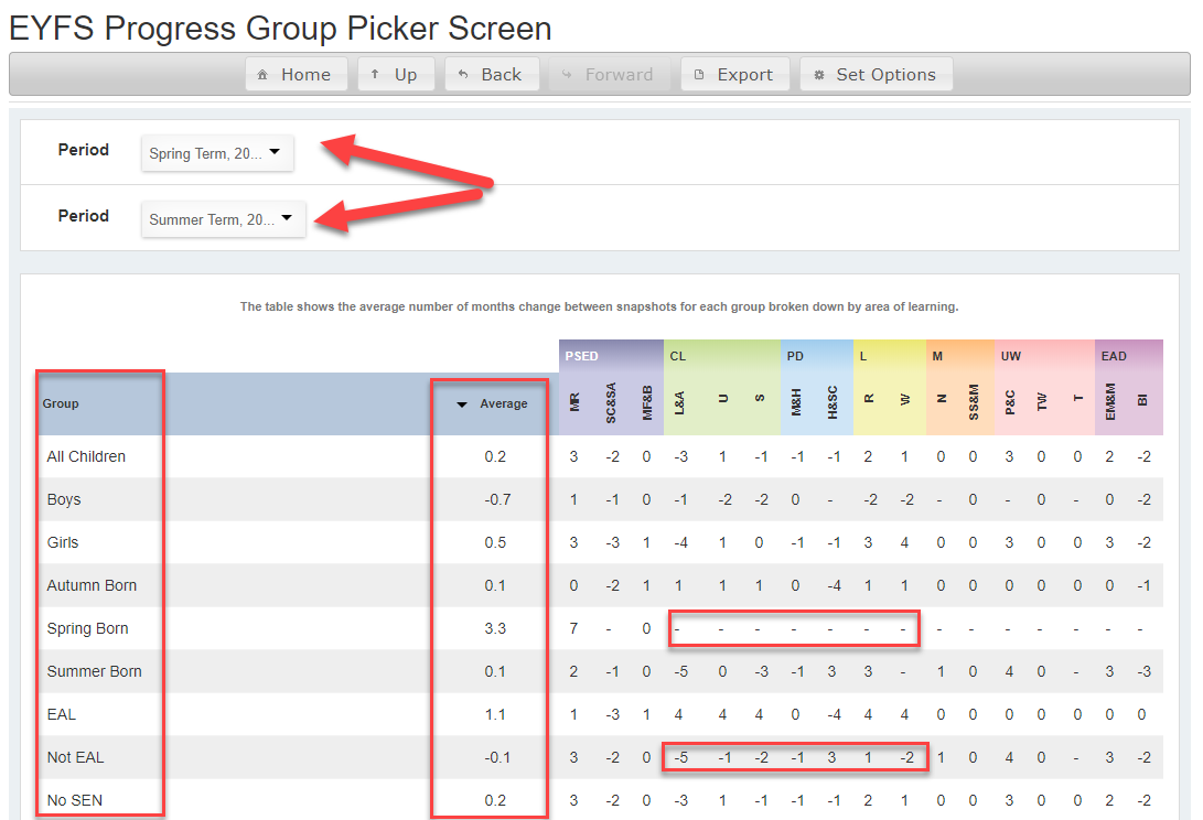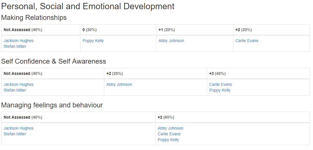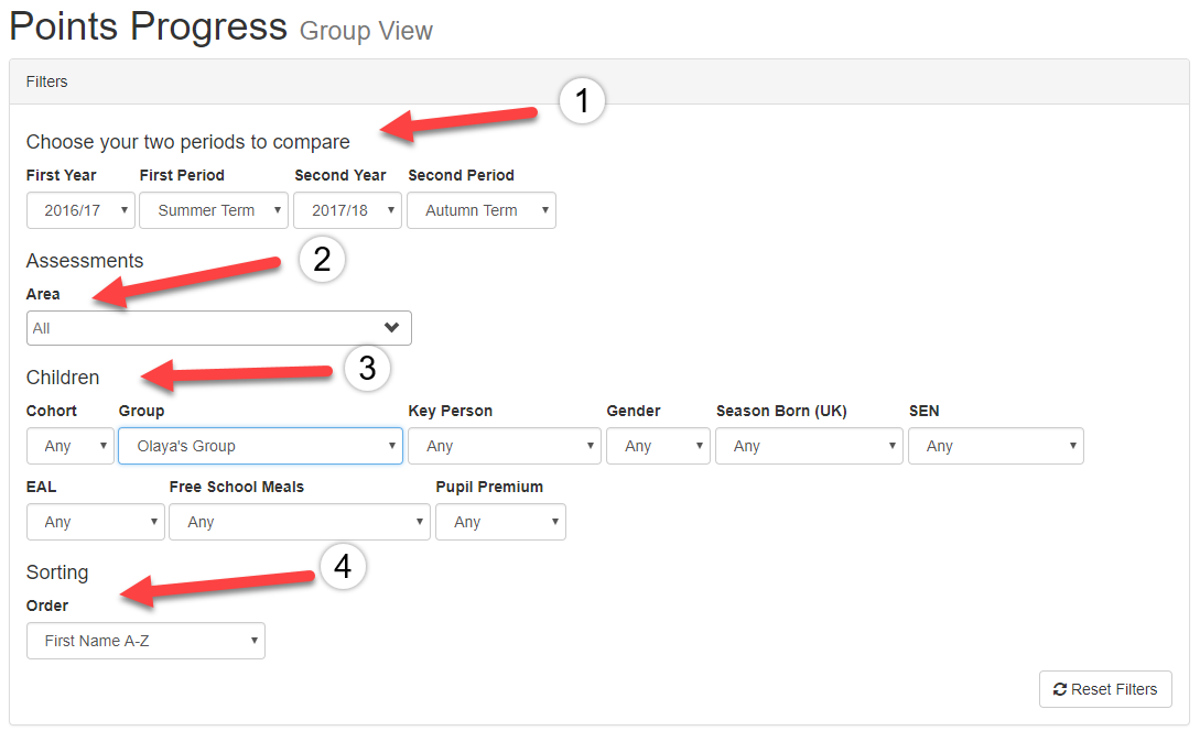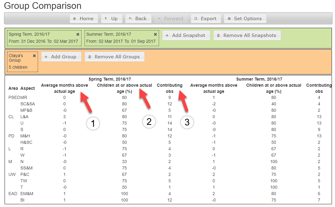 OlayaTapestrySupport Posted December 14, 2017 Posted December 14, 2017 Please note that this tutorial is about tracking groups of children for the old EYFS. For information about tracking screens for groups for the new EYFS 2021, please click here. Similarly to how you can view how much progress an individual child is making, there are several different ways in which you can learn how much progress a group of children is making. There are a couple things you need to bear in mind to understand group progress: Any percentages shown are for the number of children that have been assessed for each area and/or aspect within the group. That is, if there are 15 children in a group, but only 10 have been assessed for a specific area, the percentage will be calculated over 10 children. Any other figures are calculated by finding the progress score for each individual child in the group, adding all of those up, and dividing it by the number of children with progress scores in the group. There are four different screens where you can view group progress: Age band tracker Points Progress screen Comparison group Progress Picker screen We'll go through them one at a time, starting with the age band tracker. You can also use the links above to skip to a relevant section of this tutorial. Age band tracker The age band tracker is a screen within the tracking tab. This screen shows you the average assessment scores for the individuals within the group for several periods side by side. This is the more visual representation of progress and doesn't take the group's average age into account - it just shows how they have moved through the age bands and refinements. You can find it by going to the Tracking tab, ensuring that you are on the EYFS sections, and clicking on the ‘group view’ button in the age band tracker box. This will take you to a page where you’ll be able to choose the group you want to see the progress for - this can be either a group added by you, or groups based on cohort, key person, gender, season born, etc. You will also be able to select a start period and an end period, which will determine the number of terms that you will see the progress for. For the purpose of this tutorial, I’m going to analyse the progress for 'Olaya's Group’, and I will take a look from Spring Term 2015/2016 to Autumn Term 2017/2016. Once you've set your filters, you will see a chart like the one shown below for each aspect of the EYFS. You will see that each column refers to a period and each row refers to a specific age band and refinement. The aspects of learning are divided in different charts, so you can scroll through directly to the one that most interests you. You will also see each child's name in the box that corresponds with their age band and refinement for each period they've been assessed in. This score is taken from the summative assessment screen. The percentage refers to the percentage of children within the chosen group that were assessed for that aspect for each period. Remember that the percentage is calculated over the number of children within the chosen group that were assessed for each aspect and for each period. For example, in the chart below you can see that 40% of the 5 children that were assessed for Making Relationships in Summer Term 2016/2017 were assessed at 30-50 Developing. If you'd like to isolate the percentages for a period from the rest of the information displayed, simply hover your mouse over any of the percentage numbers for the corresponding period. Points Progress screen The points progress screen will show you how many points of progress - or refinement 'jumps' - a child has made between two periods, and the percentage of children in each group making however many points progress. You’ll find this screen by clicking on the ‘Points Progress’ button in the Progress box in the EYFS analysis section from the ‘Tracking’ tab. Here you can select two periods (1) to compare and Tapestry will calculate a ‘points progress score’ based on how many points of progress (i.e. refinement jumps) the children have made between in those two periods. You can also narrow your search down by area of assessment (2) and type of group (3). You can also sort the list order by name, most observations, youngest, etc. (4) After this, you will be presented with a series of grids containing either a positive or negative number (for if they've moved backwards). There will also be a grid named 'not assessed'. The numbers represent how many refinements a child has moved. We consider moving from 30-50 secure to 40-60 emerging as a refinement 'jump' as well. For example, if a child moved from 22-36 secure, to 30-50 emerging, this would be a score of +1. Also, if a child gone backwards from 16-26 developing to 8-20 secure, this would be a score of - 2. Please note that if you haven't included the refinements on your summative assessment, the system will consider all refinements as 'developing', so any jumps will be considered from whichever age band developing to whichever age band developing. ‘Not assessed’ means that there isn't an assessment for these children for that aspect in at least one of the 2 periods you have selected. From a group analysis point of view, the interest lies in that you can see exactly the percentage of children that have moved +1, -4 or 0, for instance, as well as the percentage of children in the group that were not assessed for that aspect for either or both of the chosen periods. Comparison group This screen works out a numerical value based on how many months the average group age is away from their average assessed age and the percentage of children that were assessed at or above their age. The interesting thing about this screen is that you can have two periods side by side, so you can compare the figures from one period to another. To get to this screen you need to go back to the Tracking tab, EYFS section, and click on the 'Comparison: Group' b