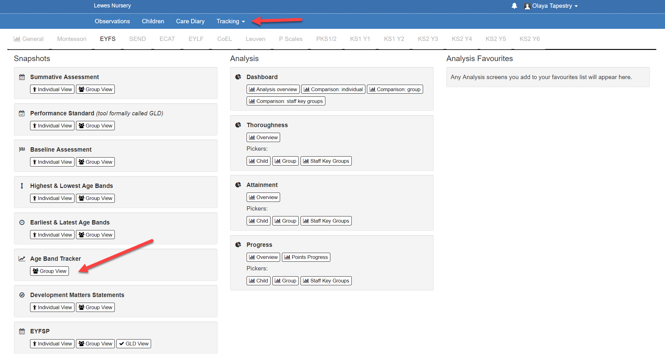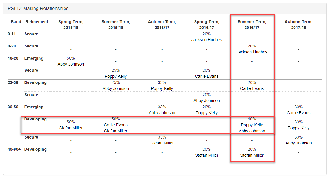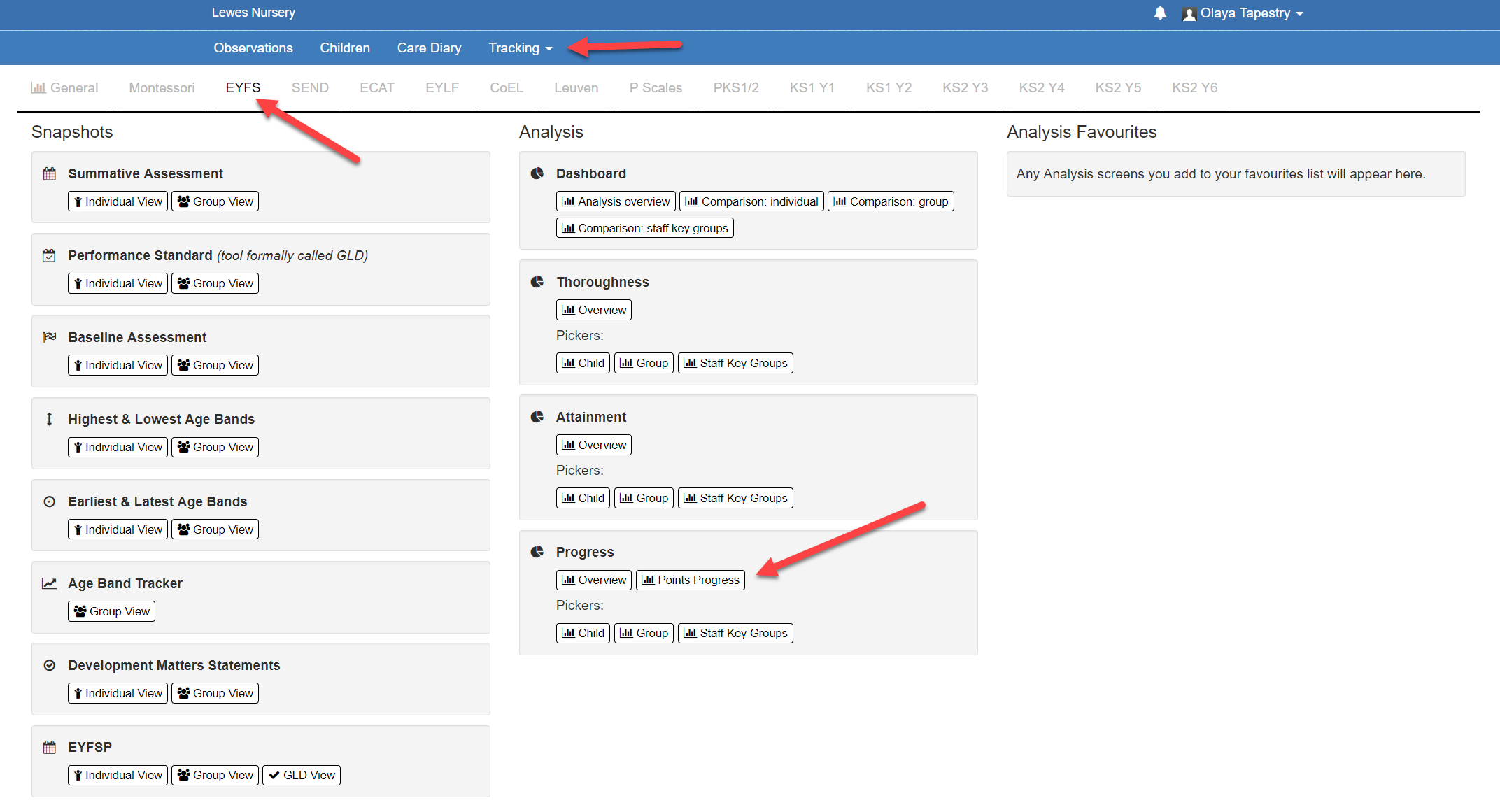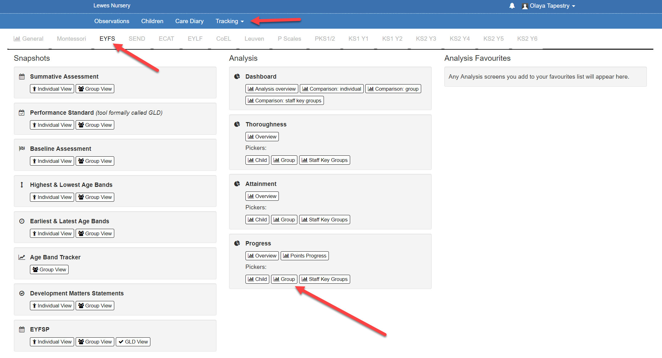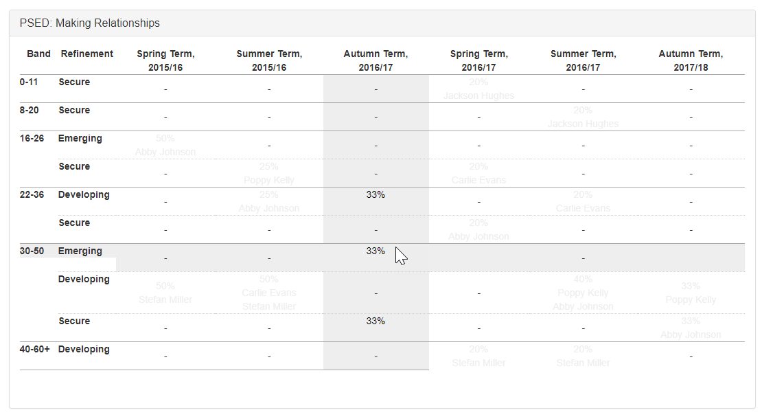 OlayaTapestrySupport Posted December 14, 2017 Posted December 14, 2017 Please note that this tutorial is about tracking groups of children for the old EYFS. For information about tracking screens for groups for the new EYFS 2021, please click here. Similarly to how you can view how much progress an individual child is making, there are several different ways in which you can learn how much progress a group of children is making. There are a couple things you need to bear in mind to understand group progress: Any percentages shown are for the number of children that have been assessed for each area and/or aspect within the group. That is, if there are 15 children in a group, but only 10 have been assessed for a specific area, the percentage will be calculated over 10 children. Any other figures are calculated by finding the progress score for each individual child in the group, adding all of those up, and dividing it by the number of children with progress scores in the group. There are four different screens where you can view group progress: Age band tracker Points Progress screen Comparison group Progress Picker screen We'll go through them one at a time, starting with the age band tracker. You can also use the links above to skip to a relevant section of this tutorial. Age band tracker The age band tracker is a screen within the tracking tab. This screen shows you the average assessment scores for the individuals within the group for several periods side by side. This is the more visual representation of progress and doesn't take the group's average age into account - it just shows how they have moved through the age bands and refinements. You can find it by going to the Tracking tab, ensuring that you are on the EYFS sections, and clicking on the ‘group view’ button in the age band tracker box. This will take you to a page where you’ll be able to choose the group you want to see the progress for - this can be either a group added by you, or groups based on cohort, key person, gender, season born, etc. You will also be able to select a start period and an end period, which will determine the number of terms that you will see the progress for. For the purpose of this tutorial, I’m going to analyse the progress for 'Olaya's Group’, and I will take a look from Spring Term 2015/2016 to Autumn Term 2017/2016. Once you've set your filters, you will see a chart like the one shown below for each aspect of the EYFS. You will see that each column refers to a period and each row refers to a specific age band and refinement. The aspects of learning are divided in different charts, so you can scroll through directly to the one that most interests you. You will also see each child's name in the box that corresponds with their age band and refinement for each period they've been assessed in. This score is taken from the summative assessment screen. The percentage refers to the percentage of children within the chosen group that were assessed for that aspect for each period. Remember that the percentage is calculated over the number of children within the chosen group that were assessed for each aspect and for each period. For example, in the chart below you can see that 40% of the 5 children that were assessed for Making Relationships in Summer Term 2016/2017 were assessed at 30-50 Developing. If you'd like to isolate the percentages for a period from the rest of the information displayed, simply hover your mouse over any of the percentage numbers for the corresponding period. Points Progress screen The points progress screen will show you how many points of progress - or refinement 'jumps' - a child has made between two periods, and the percentage of children in each group making however many points progress. You’ll find this screen by clicking on the ‘Points Progress’ button in the Progress box in the EYFS analysis section from the ‘Tracking’ tab. Here you can select two periods (1) to compare and Tapestry will calculate a ‘points progress score’ based on how many points of progress (i.e. refinement jumps) the children have made between in those two periods. You can also narrow your search down by area of assessment (2) and type of group (3). You can also sort the list order by name, most observations, youngest, etc. (4) After this, you will be presented with a series of grids containing either a positive or negative number (for if they've moved backwards). There will also be a grid named 'not assessed'. The numbers represent how many refinements a child has moved. We consider moving from 30-50 secure to 40-60 emerging as a refinement 'jump' as well. For example, if a child moved from 22-36 secure, to 30-50 emerging, this would be a score of +1. Also, if a child gone backwards from 16-26 developing to 8-20 secure, this would be a score of - 2. Please note that if you haven't included the refinements on your summative assessment, the system will consider all refinements as 'developing', so any jumps will be considered from whichever age band developing to whichever age band developing. ‘Not assessed’ means that there isn't an assessment for these children for that aspect in at least one of the 2 periods you have selected. From a group analysis point of view, the interest lies in that you can see exactly the percentage of children that have moved +1, -4 or 0, for instance, as well as the percentage of children in the group that were not assessed for that aspect for either or both of the chosen periods. Comparison group This screen works out a numerical value based on how many months the average group age is away from their average assessed age and the percentage of children that were assessed at or above their age. The interesting thing about this screen is that you can have two periods side by side, so you can compare the figures from one period to another. To get to this screen you need to go back to the Tracking tab, EYFS section, and click on the 'Comparison: Group' b