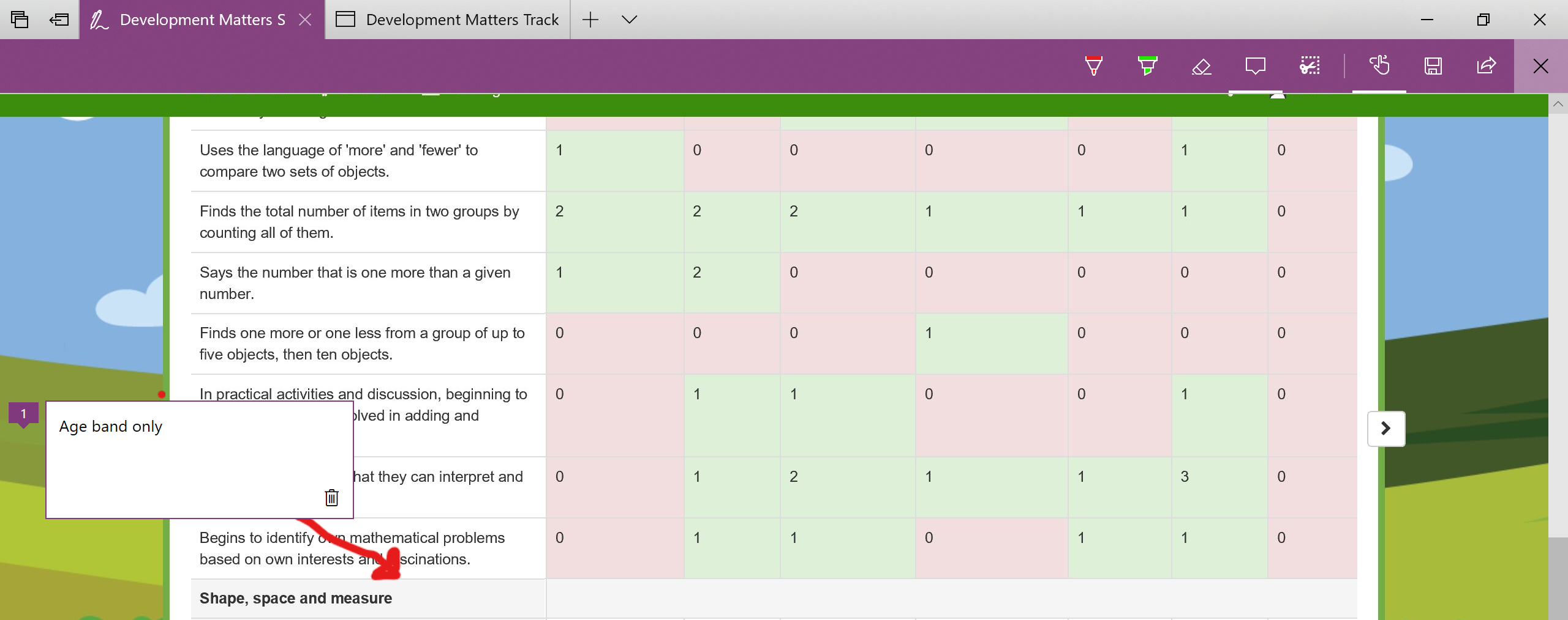 AnonyMouse_5892 Posted May 30, 2018 Author Posted May 30, 2018 (edited) Thanks Lauren, I have looked at the other options and they don't show me what I am looking for. My head teacher and I find the 'Development Matters Statement' screen ideal when seeing how many observations for each DM statement there are in each aspect for each child. The Thoroughness Child Picker screen doesn't indicate which DM statements relate to the observation. If the DM statement screen had a section for 'age band only' at the bottom of each age band (I have attempted to show you what I mean in the attached screenshot!) this would reveal all observations in the aspect we are looking at, rather than the just ones that have a DM statement ticked. For example, in SSM we might not tick the statement "Orders two items by weight or capacity" if a child is observed comparing the weight of different objects with balance scales. However, we will tick 40-60+ age band only. This will not show up in the DM statement screen. If this were possible, it would be very useful. Edited May 30, 2018 by millhill Quote