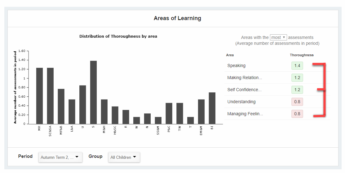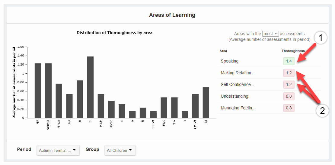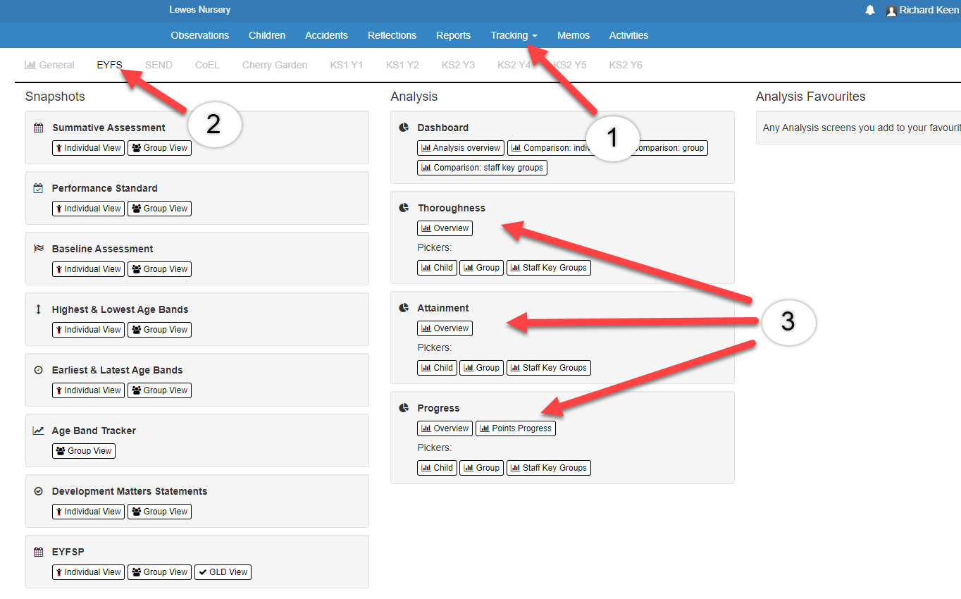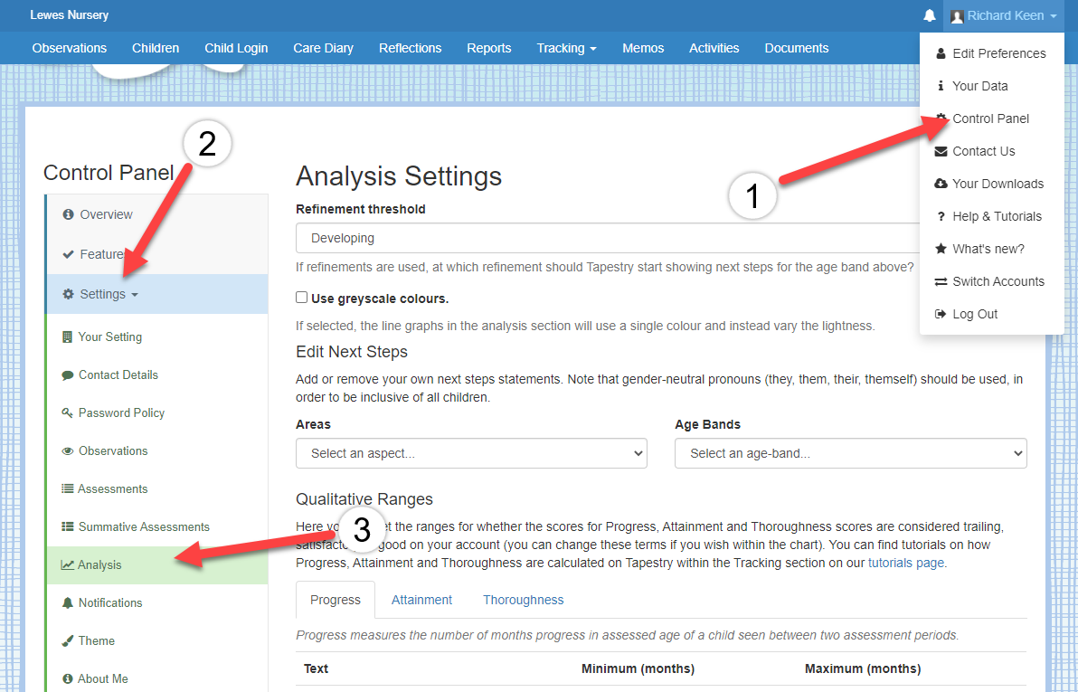 EmilyTapestrySupport Posted March 4, 2019 Posted March 4, 2019 Please note that this tutorial is about tracking for the old EYFS. For information about tracking screens for the new EYFS 2021, please click here. In this tutorial we're going to cover of the different settings that are available for the EYFS Analysis on Tapestry. You can find this section by going to the Control Panel (1), then selecting 'Settings' (2) and from this drop-down choose the 'Analysis' option (3). The first section of this page refers to the Next Steps on Tapestry, you can read this tutorial here for information on what each of this options means. In this tutorial we're going to be looking at the 'Qualitative Ranges' section. These are used for the overview graphs in the analysis section of Tapestry and control the colour coded sections - so what is trailing, satisfactory, and good (or whatever terminology you choose to use). This setting contains 3 tabs for 'Progress', 'Attainment' and 'Thoroughness'. I've given a brief description of how scores for each one are calculated on Tapestry but please see below links for more in-depth tutorials about this. Attainment: This is the number of months above or below their actual age that a child has been assessed as, so an attainment score of 0 means a child is working at their exact actual age. Progress: This is the difference in attainments for a child across two periods. A progress score of 0 means that they are progressing at the same rate as they are ageing. Thoroughness: This is the average number of assessments made in an Aspect for a child throughout a period (so the total number of assessments divided by 17). How attainment scores on Tapestry are calculated How progress scores on Tapestry are calculated How thoroughness scores on Tapestry are calculated So let's have a closer look at this chart now. At the top you can use the tabs to set whether you are setting the range for progress, attainment or thoroughness (1). In this tutorial I'm going to focus on 'thoroughness', so the average number of assessments. In the text boxes (2) you can change the Tapestry terminology from 'trailing', 'satisfactory' or 'good' to terms you use in your setting if you wish. Then in the 'Minimum' and 'Maximum' boxes (3) you can set the ranges for your setting. If the boxes are greyed out this means it's not possible to change this score. For example with thoroughness you can't set it below 0 as it's not possible for a child to have less than 0 assessments on Tapestry. Here I've set the minimum requirement for a child's thoroughness score to be Satisfactory as 1. Remember, a child's thoroughness score is an average of their assessments, so a total thoroughness score of 1 would mean a child has 17 assessments (because there are 17 Aspects - but the assessments can be spread randomly between the Aspects, this doesn't mean they will have to have 1 assessment per Aspect). The '+' and '-' buttons (4) either add or remove a threshold in case you wanted to have more or less than three. The 'Reset' button (5) sets all the thresholds back to the last saved state i.e. undoes any customisation performed in the current session and the 'Set Default Ranges' button (6) sets all the thresholds in the tab back to "factory settings" i.e. no customisation. Make sure you press the 'Save' button (6) when you're happy with the values you've selected. Making changes to these ranges won't change the actual thoroughness, attainment or progress scores for children, but it might change the colour coding for them on the Overview Graphs. You can find these graphs by going to the Tracking tab at the top of the page (1), select the EYFS section (2), then click on the 'Overview' button in either the thoroughness, attainment or progress sections (3). Below you can see an example of one of these graphs - this one is the Thoroughness Area of Learning graph. The scores we are looking at are on the right-hand side. This shows you the Aspects with the most assessments. You can see in the 'Thoroughness' column the thoroughness scores for each of these Aspects and they are also colour coded as green and pink. The green Aspects, 'speaking', 'making relationships' and 'self-confidence', are ones where the thoroughness scores are considered as 'satisfactory' by the ranges we have set. The Aspects 'understanding' and 'managing feelings and behaviour' are showing as pink as these thoroughness scores are currently considered as 'trailing'. I'm now going to show you what happens if we change the ranges for thoroughness. I'm going to change it so the range for 'satisfactory' is actually 1.3-2, rather than 1-2 as it is currently. You'll see that now that I have done this, the score for speaking has stayed as green (1) but the ones for making relationships and self confidence and self awareness have changed to pink (2). This is because the thoroughness score of 1.2 is now considered as trailing. Now that you understand these ranges you can go head and set them to whatever suits your setting! Go back to Main Tutorials Page