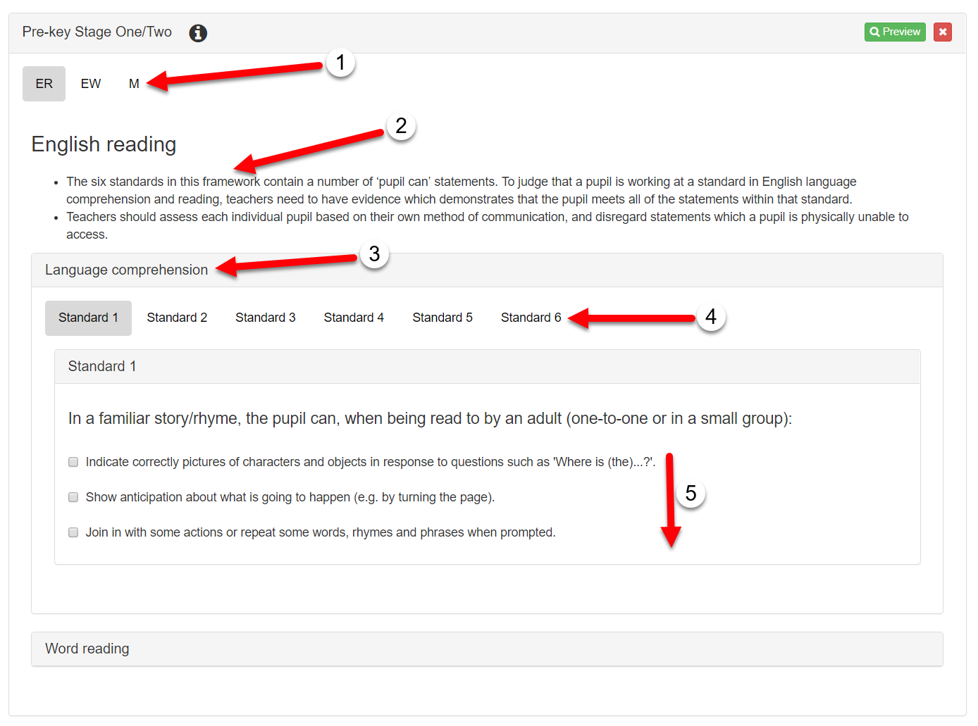 After adding the Pre-Key Stage framework into an observation, you can then choose which subject you want to assess with (1) and for each one there is a short explanation about how to make the assessment (2). For each subject you will then need to choose an area (3) and standard (4) to assess with and you can then select the appropriate statement/s (5).