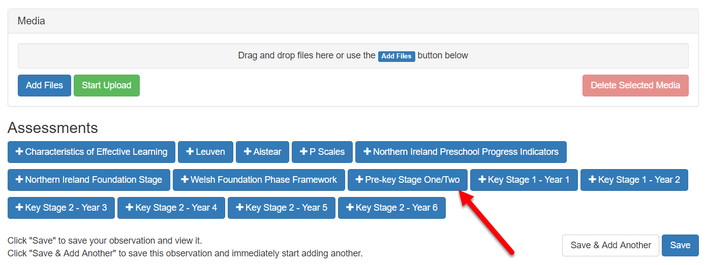 Now that you have the Pre-Key Stage Framework enabled on your account, when you go to add an observation, you will be able to assess with it. If you have more than 2 frameworks on your account, you will see them all listed here and to assess with one you just need to select that button, so in this case I just need to choose 'Pre-key Stage One/Two'.