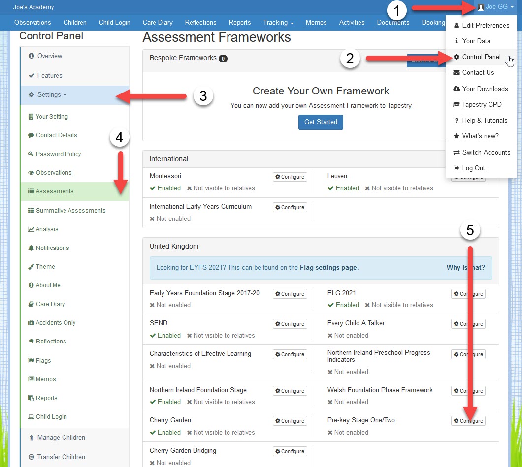 Before you can start assessing with the Pre-Key Stage 1 and 2 framework, you will need to enable it on your account. To do this a manager just needs to click on their name in the top right-hand corner of the screen (1) and select 'Control Panel' from the drop-down (2). Once on the Control Panel, you just need to select 'Settings' (3) and then 'Assessments' from that drop-down (4). On the Assessments page you will need to find the option 'Pre-key Stage One/Two' and once you do, click on the 'Configure' button (5).