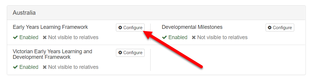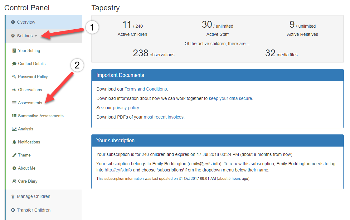 EmilyTapestrySupport Posted June 3, 2019 Posted June 3, 2019 There are currently seventeen different assessment types that you can use in Tapestry: EYFS Assessment with Development Matters age bands Every Child a Talker (ECAT) SEND The Montessori Curriculum Pre-Key Stage 1/2 Key Stage 1 Key Stage 2 Early Years Learning Framework Victorian Early Years Learning and Development Framework Developmental Milestones Characteristics of Effective Learning Leuven Scales Aistear (Ireland) P Scales Northern Ireland Preschool Progress Indicators Northern Ireland Foundation Stage Welsh Foundation Phase Framework Tapestry allows you to enable and disable these individually, so that staff can either access them, or not, when creating observations. You also have the option to allow parents to view each active assessment type in observations (but not to create or edit them). It's very straightforward to set these as you wish - simply log into the browser version as a manager and go to your Control Panel: Then go to 'Settings' (1) and 'Assessments' (2). From there you'll need to click on the 'Configure' button to the left of the assessment type that you would like your staff members/relatives to access (or to not access). Here you'll be able to enable the framework (1) and choose whether relatives can see it (2). If this framework has any extra options, such as enabling refinements, you'll see these appear underneath (3). Once you're done, you just need to click 'Submit' (4)!