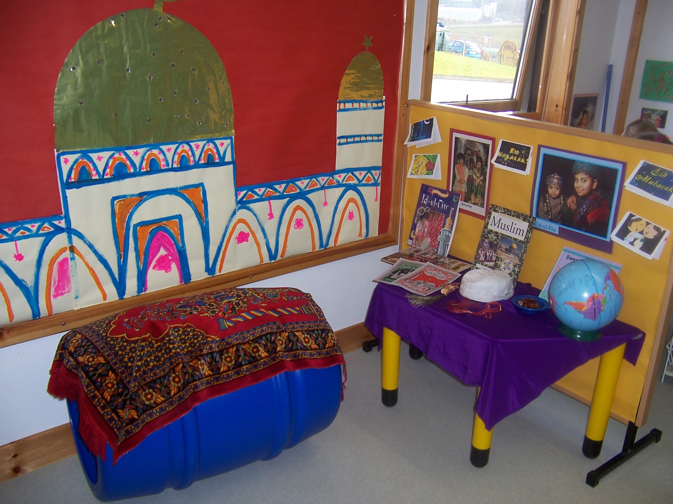 Guest Posted September 17, 2006 Posted September 17, 2006 (edited) We focussed on Eid for a week last year to raise the self esteem of 2 children and their families in the class.Here are some of the activities we did (pasted from planning so sorry if they seem misjointed ) Look at non fiction books about Eid Discussions about Eid – especially with the two muslim mums and the muslim children in the class Express likes/dislikes of dates and Eid pudding Display examples of ‘Happy Eid’ in English, Urdu and Bengali Sign name on Eid cards Posters on display Listen to Eid song and story by A's mum. 'A date to Eat' - story ‘Happy Eid’ song in Arabic (A's mum) A's mum to talk about visiting a mosque and praying 5 times a day. Artefacts brought in – prayer mat, hat, oils Visitors and their children to dress in traditional dress. Eid cooking (star and moon biscuits, eid desert) and sweet giving. Look at globe to find where the 2 children used to live in relation to here. Try dates at snack time. Develop an awareness of cultural and religious festivals. Making and giving Eid cards and sweets. Take photographs Palydough with glitter in – use rolling pins and star/moon cutters. Cutting out hand shapes for Mendhi patterns Eid el Fitr jigsaw Decorate shiny stars Clay moon and stars – using cutters, decorate and suspend Print out Eid card Star and moon printing with paint – selection and choice. Designing a Mendhi pattern on cut out hand Mendhi pattern on girls hands (A's mum) Learn ‘Happy Eid’ song (A's mum) We had a fantastic week and the 2 children in question just puffed up with importance; their mums came and worked with us and made the staff a 3 course meal at the end because they had enjoyed themselves so much! I may attempt to put some pictures on for you but I've never tried it before so it may take a few days Ok trying an attachment This was our display(not quite finished in the picture) - one of the mums decided to do the mosque on the wall so a bit adult led but I hadn't the heart to stop her We hung the painted clay mooons and stars around it and infront of it. Edited September 17, 2006 by Guest